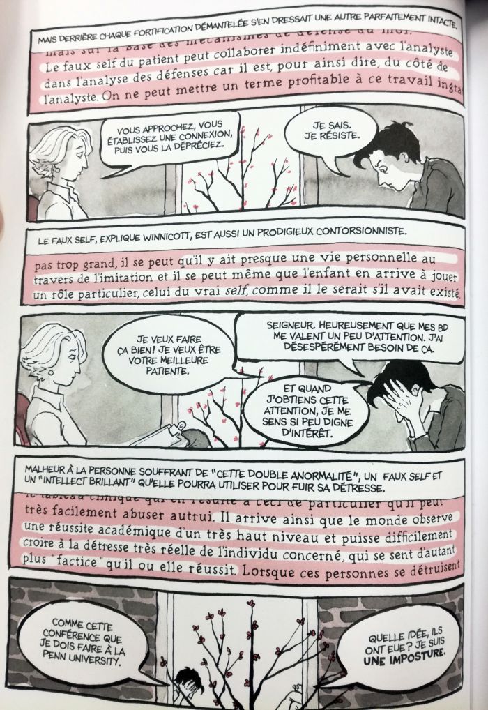 Après le succès de Fun Home consacré à son père, Alison Bechdel a enchaîné quelques années plus tard avec C’est toi ma maman ? consacré à sa mère. Sur le fond, les deux BD se ressemblent, mais j’ai noté des différences importantes. On ne pouvait certes pas qualifier Fun Home de “léger”, mais il laissait tout de même de la place à cet humour froid qui m’avait beaucoup plu. Cette BD-ci est encore plus dense et cérébrale. L’autrice la consacre en grande partie à ses séances de psychothérapie et à ses lectures de psychanalystes (avec des citations généralement cryptiques, au mieux). Elle s’intéresse aussi beaucoup aux écrits de Virginia Woolf, heureusement beaucoup plus lisibles.