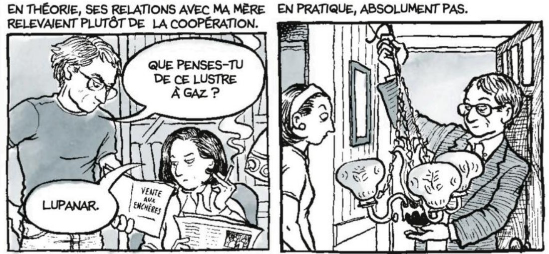 En fait, le terme “tragicomédie” est très approprié : c’est globalement dramatique, mais ce qui nous est raconté est rempli d’humour glacial. De temps en temps surgit une référence littéraire (Proust, James Joyce) : père et fille entretenaient un lien apparemment profond autour de la littérature. Quant au dessin, en noir et blanc, il se prête très bien à la version poche qui est arrivée entre mes mains, qui se lit comme un roman. À lire sa page Wikipédia, cette BD semble avoir affolé les franges les plus conservatrices des États-Unis (qui ne déçoivent jamais), la page dénombrant pas moins de six tentatives de censure en raison des thèmes abordés. En ce qui me concerne j’ai beaucoup aimé et je ne tarderai pas à enchaîner avec C’est toi ma maman ?, dans lequel Alison Bechdel se penche cette fois sur sa mère.